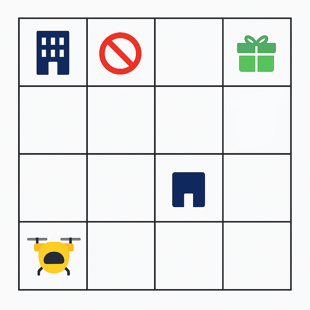 Imagine a busy futuristic city seen from above, a grid of rooftops, roads, and no-fly zones. Our little delivery drone starts its day at the bottom-left corner of this city grid. It carries a small package that must be delivered to a customer waiting on a rooftop at the top-right corner.